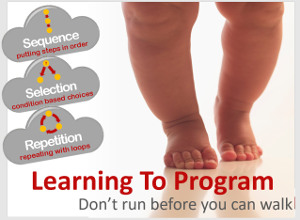 This is the first Tenderfoot Unit with a focus on learning how to program. Many teachers new to Computing will be learning a programming language for the first time. There are many good introductory manuals for different languages but they tend to focus on the specifics of the particular language, and often follow a well-defined structure, using examples to illustrate each element they cover. Similarly, most pupils, arriving in secondary schools will be familiar with the notion of algorithms as a sequence of steps. They will also have had some exposure to writing simple programs. They should have encountered sequencing instructions and used repetition and conditional expressions.