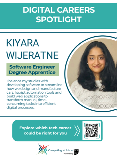 Each poster focuses on a specific digital career and includes a profile of a real person working in that role. By highlighting professionals, the posters make digital careers feel more relatable, attainable, and relevant for young people who may be beginning to think about their future pathways.